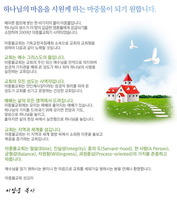 ±³È¸´Â ¼ºµµµéÀÇ °øµ¿Ã¼À̸ç, ±× ÁÖÀÎÀº ¿¹¼ö ±×¸®½ºµµÀ̽ôÙ. ¸¶Áß¹° ±³È¸ÀÇ »ç¸íÀº ÁÖÀÎÀ̽Š¿¹¼ö ±×¸®½ºµµÀÇ ¸í·ÉÀ» Àß ÀÌÇØÇϰí, Àû±ØÀûÀ¸·Î ½ÇõÇÏ´Â °ÍÀÌ´Ù.